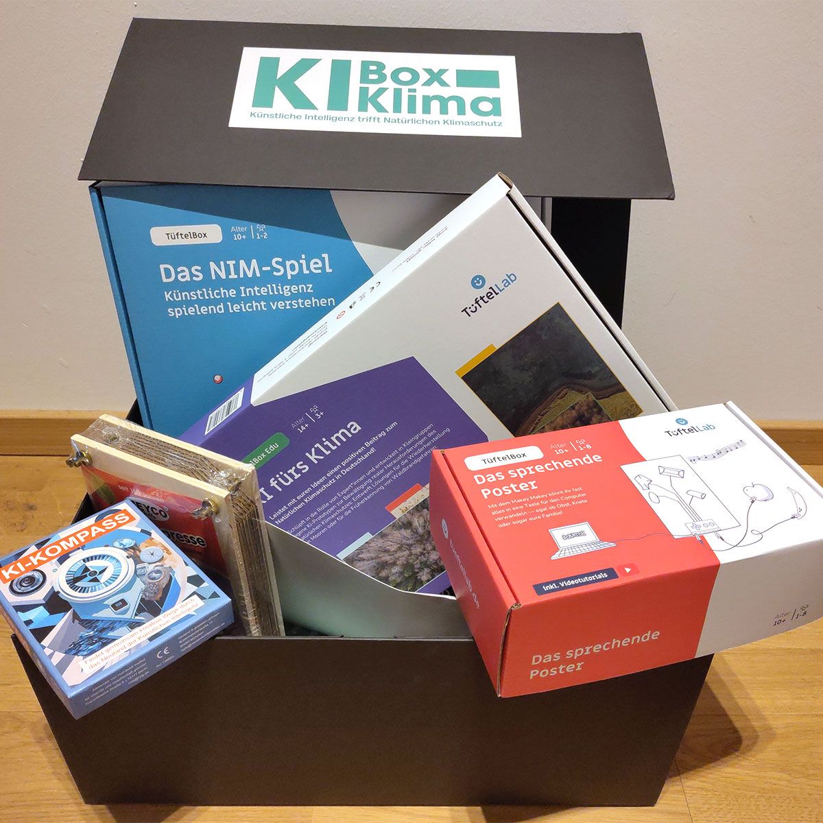 Die KI-Box Klima bietet jungen Menschen einen niedrigschwelligen und praxisorientierten Einstieg in die Zukunftsthemen Künstliche Intelligenz (KI) und Natürlicher Klimaschutz. Die Teilnehmenden erhalten eine gut bestückte Materialkiste. Ausgestattet mit Bausätzen, Spielen und aktivierenden Bildungsmaterialien bauen die Teilnehmenden Grundlagenwissen in beiden Themenfeldern auf und setzen eine der in der KI-Box Klima enthaltenen Aktionsideen um.
