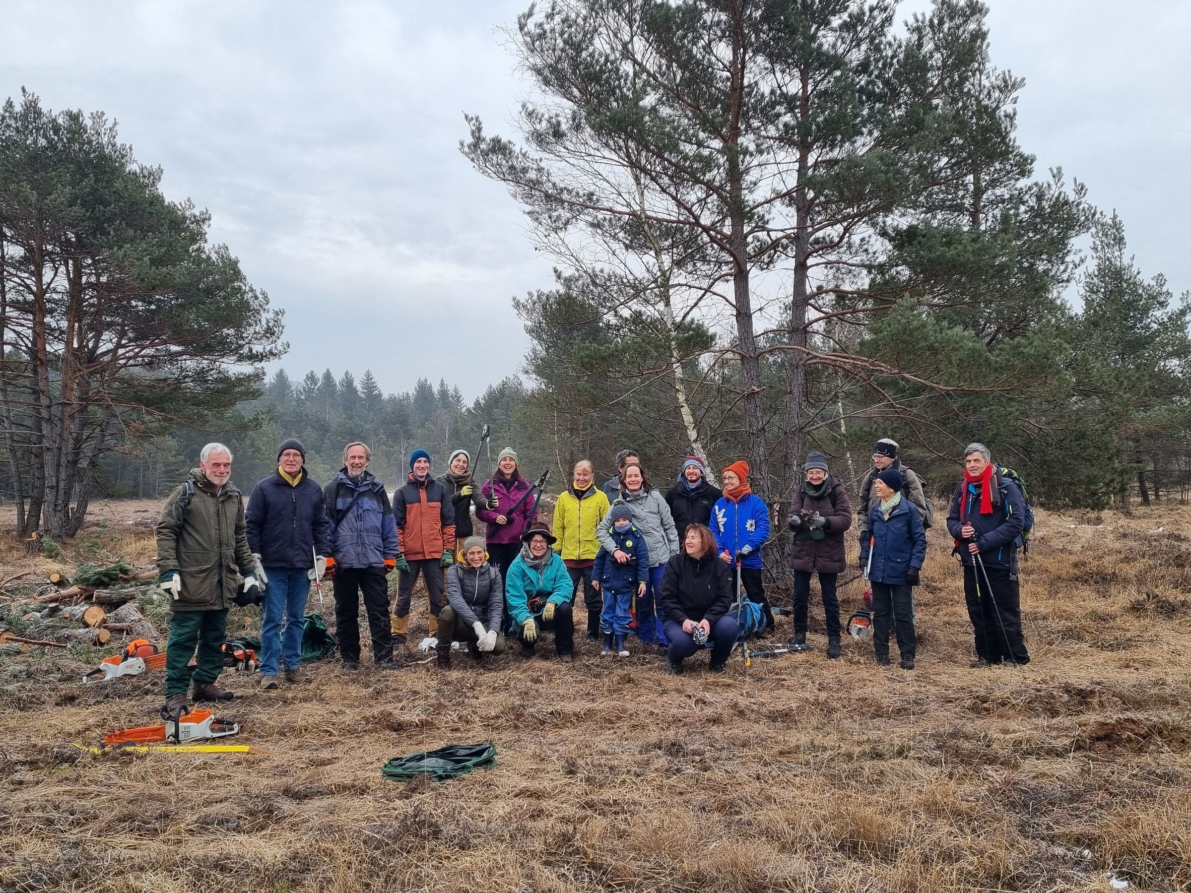 Und es kamen erfreulich viele Leute um 9 Uhr zum Start, um nochmals Jungbäume und -sträucher aus der Fläche herauszunehmen: Insgesamt 20 Leute. Die 5 Personen mit Elektro- oder Motorsäge haben der Aktion einen großen Schub gegeben, denn so konnten auch größere Exemplare umgelegt werden.