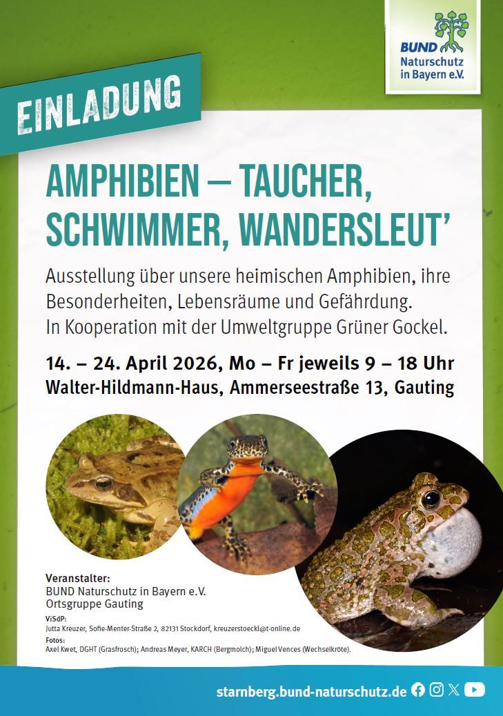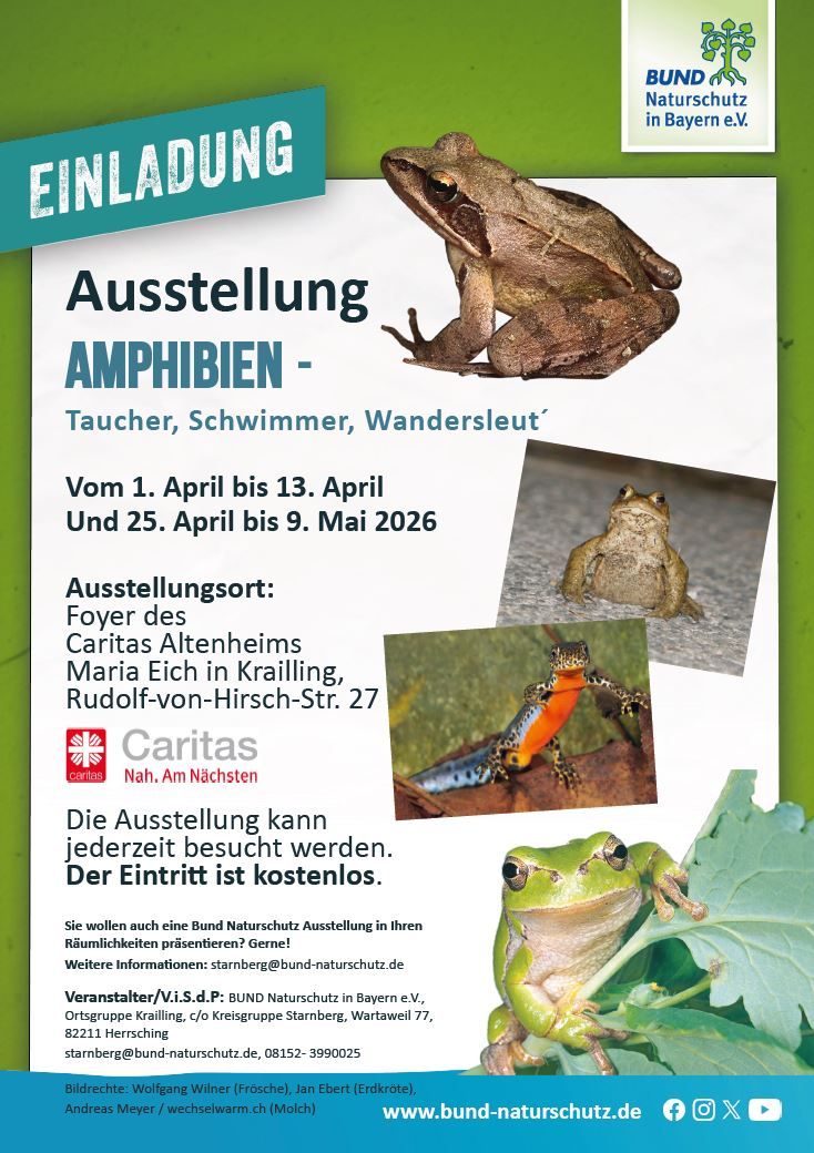 Die BUND-Naturschutz-Ausstellung „Amphibien – Taucher, Schwimmer, Wandersleut‘ “ eröffnet am 1. April im Foyer des Caritas Altenheims Maria Eich, Rudolf-von-Hirsch-Straße 27, 82152 Krailling. Sie kann täglich von 08:00 – 20:00 besucht werden. Sie geht bis zum 9. Mai. ACHTUNG: Zwischendurch, vom 14. - 24. April, ist ein Teil der Plakate in GAUTING, Walter-Hildmann-Haus, Ammerseestraße 13 zu sehen.