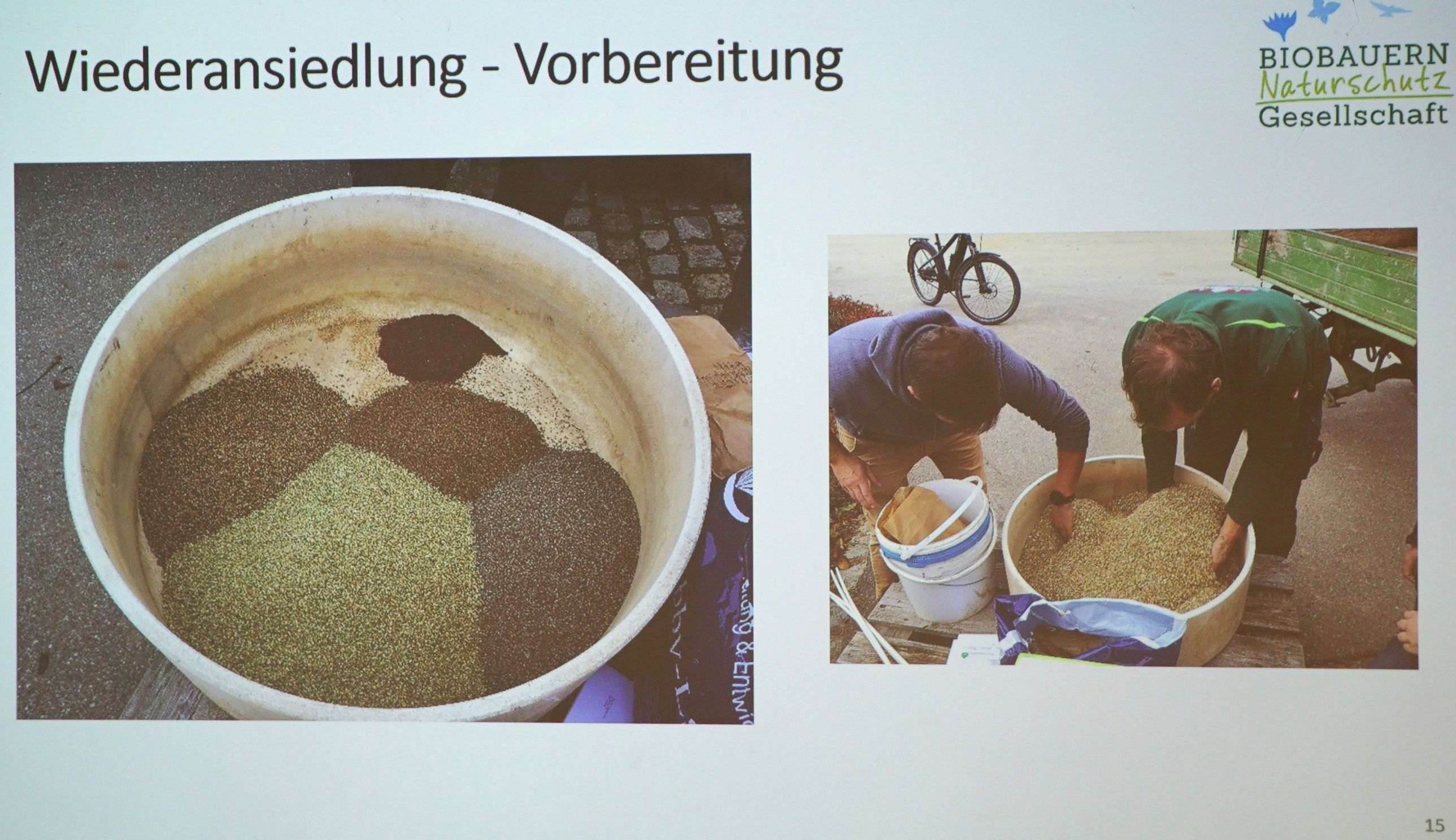 Von ihren Bemühungen zur Wiederansiedelung von Ackerwildkräutern im Rahmen des Bayerischen Naturschutzfonds berichtete Anna Kreppold von der Bioland-Naturschutzberatung Augsburg. Innerhalb des Projekts „Zukunftsperspektive für Bayerns Ackerwildkräuter“ für die Jahre 2023-2025 werden Ackerwildkräuter kartiert und eine kostenfreie Beratung zum Erhalt und zur Förderung dieser Pflanzen angeboten. Außerdem finden Öffentlichkeitsarbeit und Bildungsveranstaltungen sowie Maßnahmen zur Wiederansiedelung von Ackerwildkräutern im Fränkischen Jura und der Münchener Schotterebene statt. Das Saatgut hierfür mit Sorten wie Acker-Lichtnelke, Acker-Hahnenfuß, Acker-Steinsame, Acker-Rittersporn und Gewöhnlichem Frauenspiegel stammt aus einem Projekt der Bayerischen Kulturlandstiftung sowie aus Handsammlungen. Die Samen werden gesammelt, die Pflänzchen angezogen, auf geeignetem Boden gepflanzt, geerntet, die Samen verpackt und auf Bestellung an interessierte Landwirte zusammen mit Informationen verschickt. An ausgesuchten Stellen säen die Landwirte geeignete Ackerwildkräuter schließlich zusammen mit dem Getreide aus, in der Hoffnung, dass sie sich langfristig etablieren.